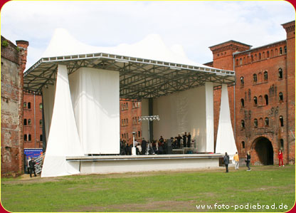 Neue Bretter, die die Welt bedeutenEndlich ist es soweit: Die neue Elblandbühne ist fertig und damit können die Elblandfestspiele seit dem Festivaljahr 2007 auf den eigenen Brettern, die die Welt bedeuten, stattfinden. Der erste Spatenstich erfolgte am 19.10.2006 durch die Vertreter der drei zum Wachstumskern Prignitz gehörenden Kommunen Perleberg, Wittenberge und Karstädt, durch den Präsidenten der Elblandfestspiele Michael Hansen und den stellvertretenden Landrat Holger Lossin. Bis zur Fertigstellung Mitte März 2007 musste aber noch einiges an Kraft und Mühe investiert werden, denn sowohl die zeitweise schlechten Witterungsbedingungen als auch die ausgefallene Dachkonstruktion, dreimal so groß wie ein Tennisplatz, stellten die Erbauer vor so manches Problem. Das Ergebnis kann sich allerdings sehen lassen. Ein ästhetisches Bauwerk ist entstanden, das in seiner leichten Bauform einen wunderbaren Kontrast zu den Backsteingebäuden der alten Speicher darstellt. Das grau-weiße geschwungene, zeltartige PVC-Dach erinnert ein wenig an das des Olympiastadions in München, auch das Material der Plane ist vergleichbar mit dem in der bayerischen Hauptstadt verwendeten. Vier 8 Meter hohe Säulen, Pylonen genannt, tragen die imposante Dachkonstruktion. Dadurch, dass die 16 x 18 Meter große Bühne von beiden Seiten bespielbar ist, können sowohl große Open-Air-Veranstaltungen als auch kleinere, intimere Formen von Kunst und Kultur hier eine Heimstatt finden. Die Kosten des Bauvorhabens von etwa 300.000 Euro wurden zu 80 % aus Landes- und EU-Mitteln gefördert, den Rest trug die Gesellschaft Elblandfestspiele e. V. selbst. Ihre offizielle Einweihung erlebt die Bühne am 12. Mai durch einen Festakt mit den Preisträgern des Gesangswettbewerbs »Paul Lincke«. Ab sofort steht die Bühne nicht nur für die Elblandfestspiele, sondern auch für andere Open-Air-Veranstaltungen zur Verfügung.